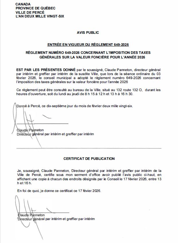 Par Reception Ville de Perce|2026-02-17T13:46:02-05:0017 février 2026|Non classifié(e)|Commentaires fermés sur AVIS PUBLIC-ENTRÉE EN VIGUEUR DU RÈGLEMENT 649-2026