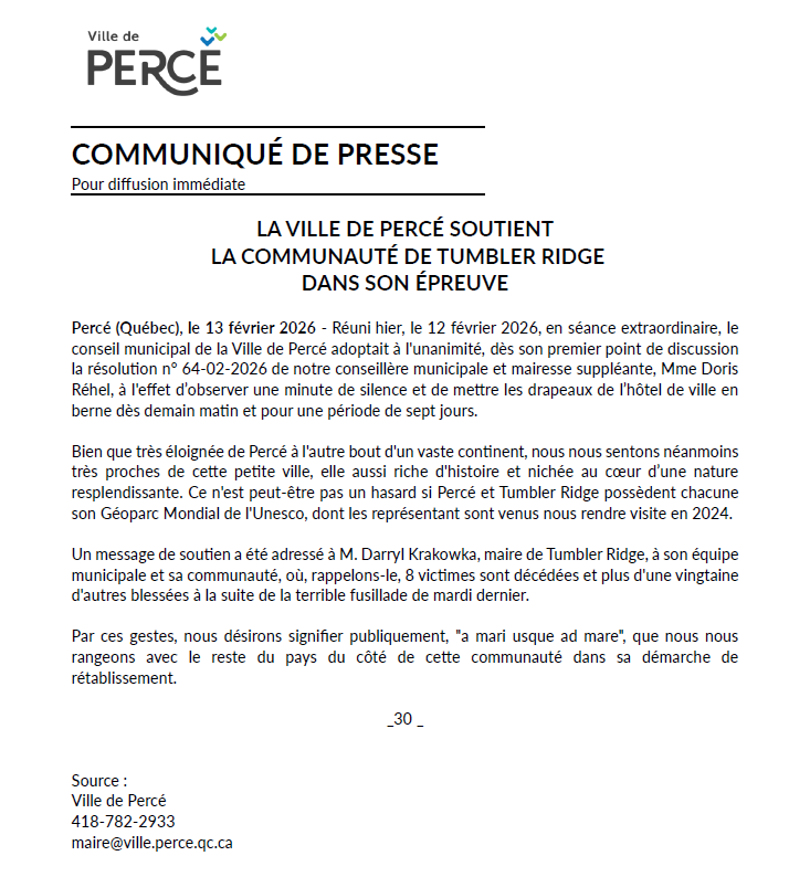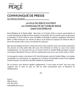 "La Ville de Percé" n'est pas responsable de la qualité linguistique de la traduction ou de la qualité technique de leur contenu.