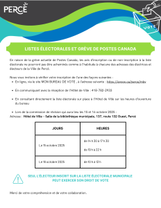 Par Reception Ville de Perce|2025-10-07T10:00:51-04:007 octobre 2025|Non classifié(e)|Commentaires fermés sur LISTES ÉLECTORALES ET GRÈVE POSTES CANADA