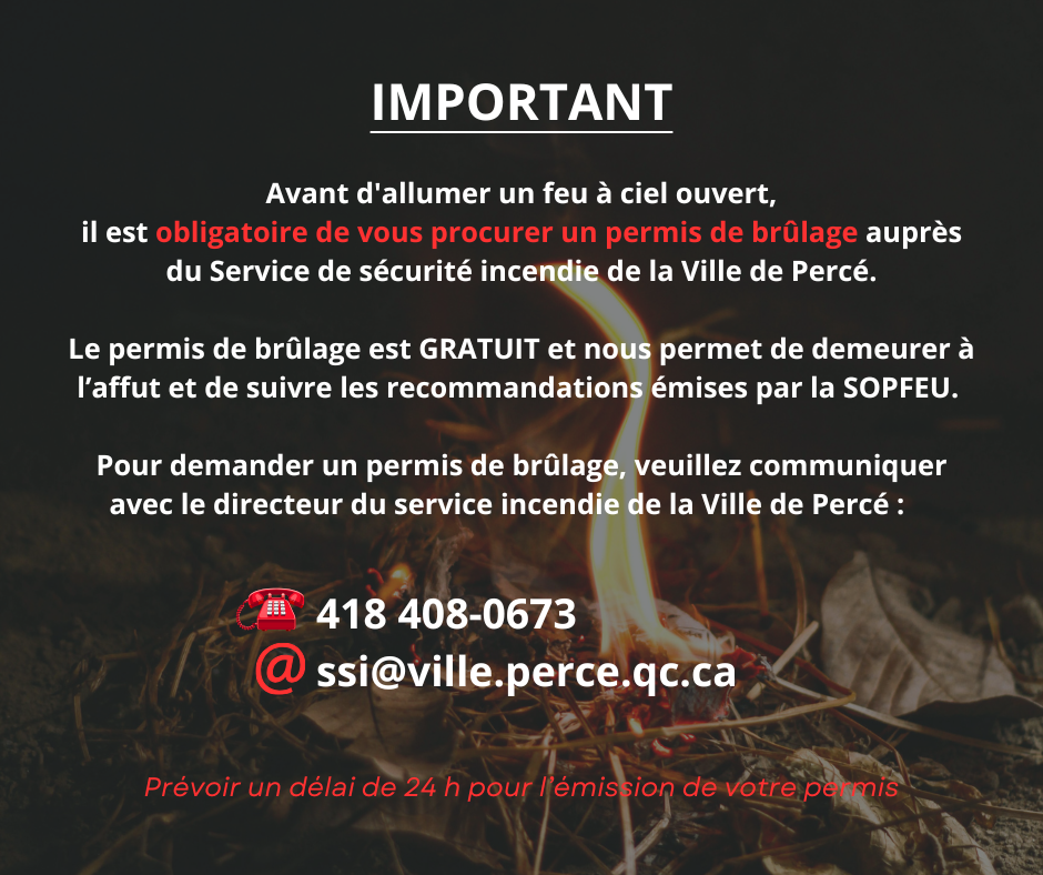 Pour demander un permis de brûlage, veuillez communiquer avec le directeur SSI de la Ville de Percé par téléphone au 418-408-0673 ou par courriel au