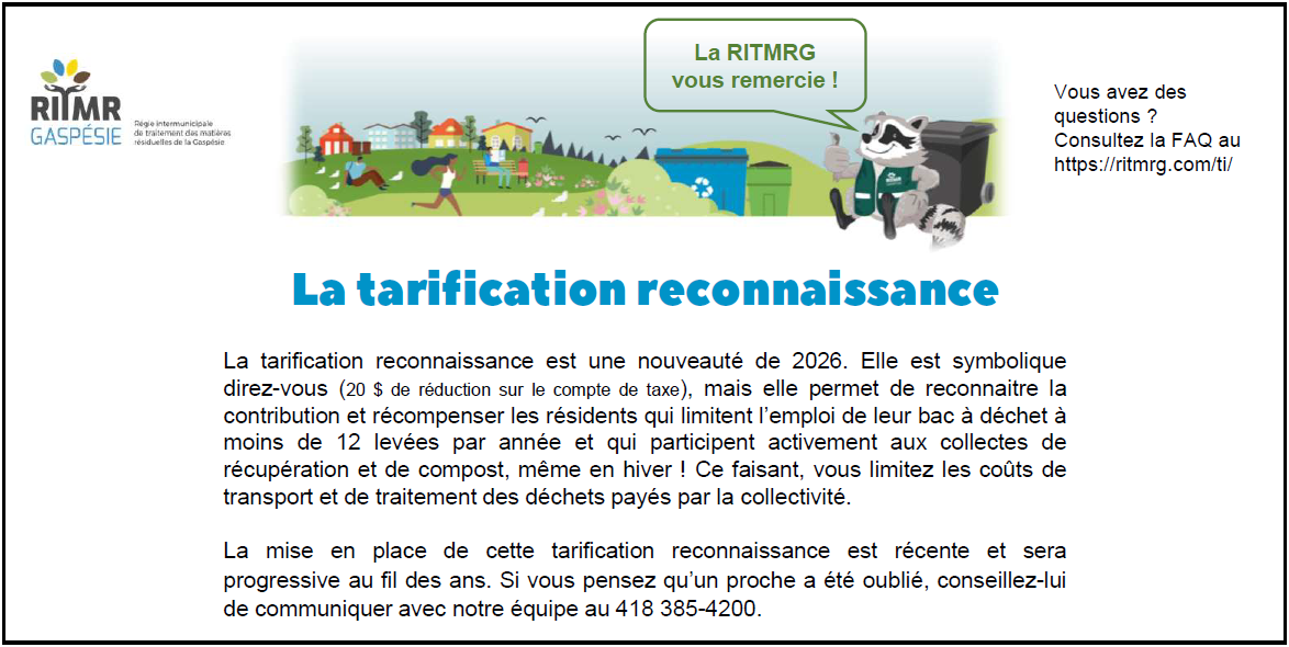 Pour plus d’informations, veuillez vous rendre sur le site de la RITMRG ⇒ Tarification incitative et reconnaissance – Régie intermunicipale de traitement des matières résiduelles de la Gaspésie